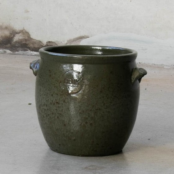 Den här handdrejade keramikkrukan tillverkas i liten skala av skickliga hantverkare, med vackert formade öron som både förskönar och förankrar designen. Den rustika ytan och den tidlösa formen gör att den passar i alla typer av miljöer – från lantligt till modernt.