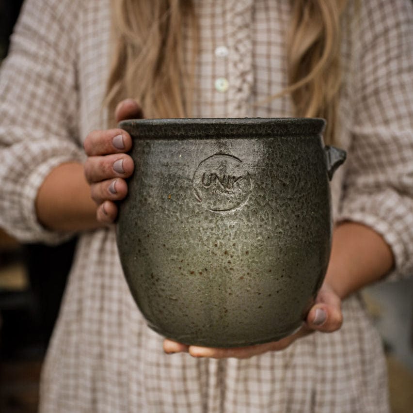 Den här handdrejade keramikkrukan tillverkas i liten skala av skickliga hantverkare, med vackert formade öron som både förskönar och förankrar designen. Den rustika ytan och den tidlösa formen gör att den passar i alla typer av miljöer – från lantligt till modernt.
