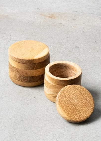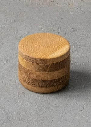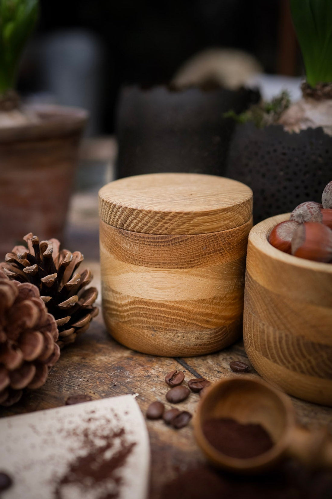En liten men karaktärsfull ekask med lock, skapad för att lyfta det enkla i vardagen. Tillverkad i massiv ek, med naturliga ådringar och en mjukt rundad form som känns lika mycket som den syns. Perfekt för småförvaring – smycken, saltkristaller, örter eller bara som en vacker detalj på hyllan. Ett hantverk i miniatyrformat med stor känsla.
