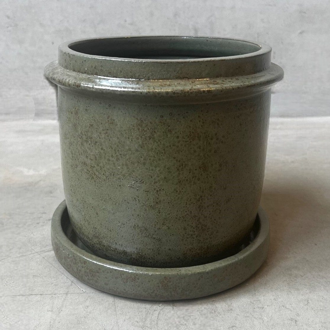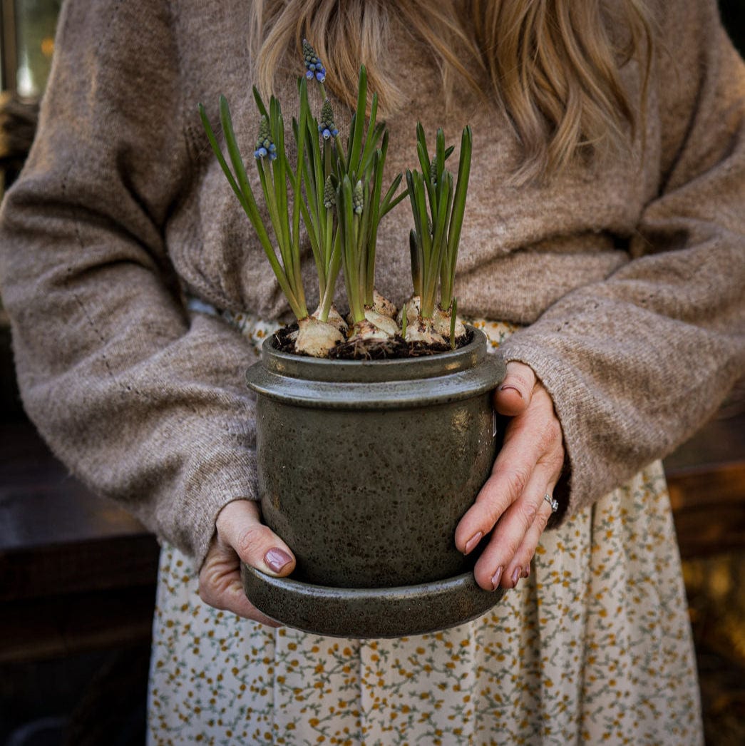 Handdrejad kruka med fat - Olivgrön 22x22 cm